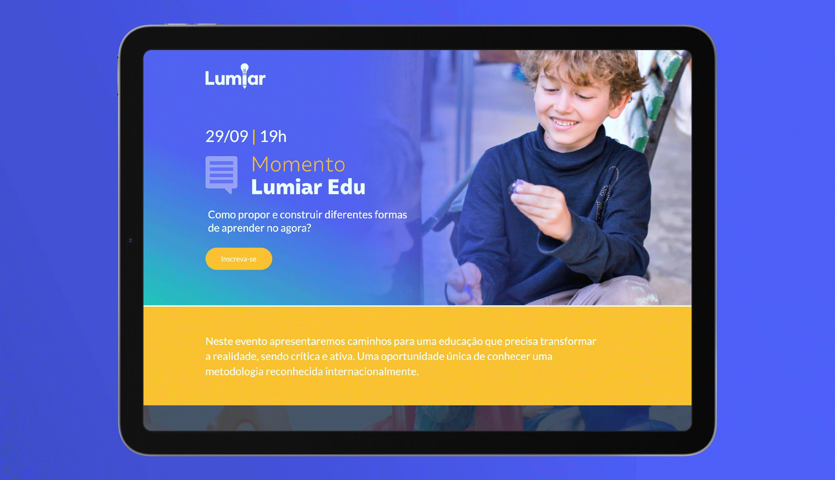 The landing page for this event aimed to convey key details and drive registrations. To set it apart from Lumiar’s traditional communications, the brand’s signature blue was used as the primary color, creating a fresh and distinctive visual identity. The traditional yellow served as a secondary color, providing a vibrant contrast and reinforcing brand recognition.